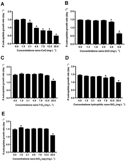 R. subcapitata growth rate after 72 h of exposure to nano-CuO (A), nano-ZnO (B), nano-TiO2 (C), hydrophilic nano-SiO2 (D), nano-SiO2 (aq) (E). The experiments were conducted in triplicate and the results are shown as the mean ± standard deviation (ANOVA followed by Dunnett’s test, * p ˂ 0.05 compared to control).