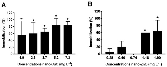 Percentage of D. magna immobilization exposed to nano-CuO (A) and nano- ZnO (B) suspensions for 48 h. Values are reported as the mean of four replicates ± standard deviation (ANOVA followed by Dunnett´s test, * p < 0.05 compared to control). Along the toxicity assays, the neonatal immobilization percentage in the control group was 0%.