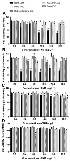 Regarding the effects of nano-CuO on SV-80 cells, a decrease of 20% in cell viability at 20 mg L−1 was observed. There are no studies regarding the toxicity of nano-CuO on the SV-80 cell line. However, for comparison, other studies have reported a decrease in the viability of human lung epithelial cells (A549 cell line) in ~90 and 93% after 18 h of exposure to 40 and 80 mg L−1 of commercial nano-CuO (hydrodynamic particle size of 220 nm), respectively [83].