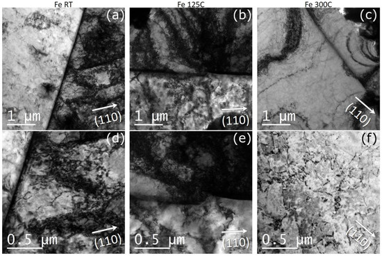 TEM micrographs showing typical dislocation patterns in plastically deformed Fe. (a,d)—deformed at room temperature, (b,e) deformed 125 °C, (c,f) deformed at 300 °C.
