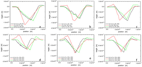 Cross-sectional height profiles from AFM images of Fe after nanoindentation: (a) Fe-AR-RT, (b) Fe-AR-125 °C, (c) Fe-AR-300 °C, (d) Fe-15%-RT, (e) Fe-15%-125 °C, (f) Fe-15%-300 °C, cf. previous figure. The 2–5 profiles of Figure 6a–c have been corrected for zero reference height away from the indent. From the AFM images and the resulting cross-sectional profiles, one notes that the formation of pile-ups in the non-deformed state of the material is relatively weak as compared to the significant piling-up observed in the pre-deformed state of the material. Pre-deformation enhances the pile-up propensity, which affects the apparent nanoindentation hardness.
