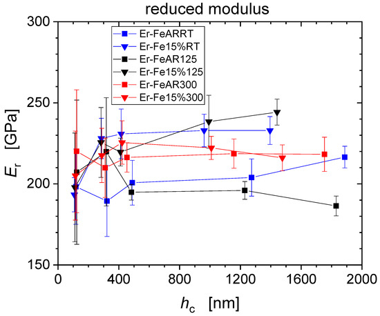 Figure 8 shows the reduced elastic modulus of the material corresponding to the indentation moduli presented previously in Figure 4. By definition, reduced modulus values are lower as compared to the indentation modulus, and range for the as-received material from ~190 GPa to ~220 GPa and for the pre-strained conditions from ~220 GPa up to ~250 GPa.