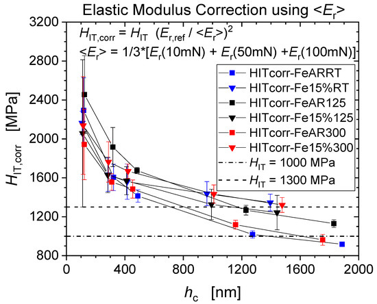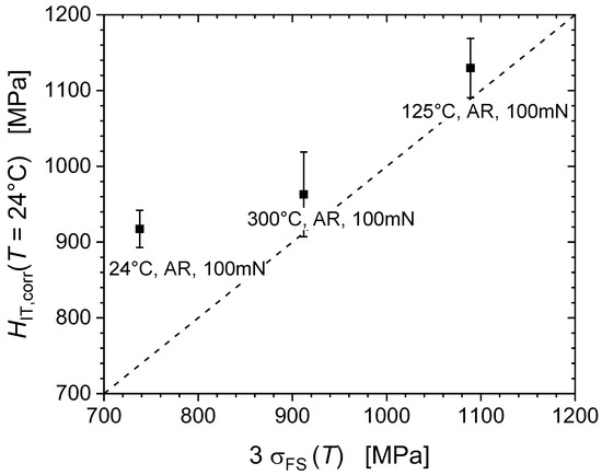 As regards the pre-deformed materials Fe-15%-125 °C (Figure 9) we observed HIT,corr to exceed by only ~100 MPa the non-deformed reference level at this temperature, i.e., the lowest increase of the three cases (24 °C: ΔHIT,corr ~ 430 MPa; 300 °C: ΔHIT,corr ~ 360 MPa). The hardening potential is the lowest for 125 °C, as the material has already hardened significantly and dislocation density is saturated, and therefore their multiplication is rendered difficult [13].