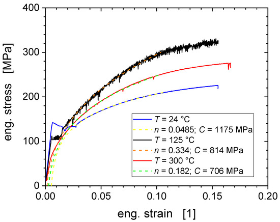 The additional hardening associated with 15% pre-deformation and observed by the EMC corrected HIT,corr at room temperature, possesses a minimum value for the intermediate pre-deformation temperature T = 125 °C, when DSA is most pronounced as shown in Figure 11. The efficient DSA at this intermediate temperature leads to reduced dynamic recovery and enhanced multiplication and accumulation of dislocations. Consequently, the work hardening rate during the tensile test is largest at 125 °C with n = 0.334 (Figure 11).