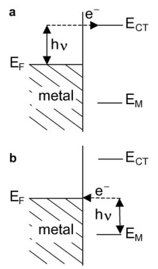 The second enhancement mechanism, which also leads to an increase in the efficiency of the generation of the Raman signal, is called the chemical enhancement. The interaction of adsorbed molecules with the metal substrate provides new electronic transitions for metal (or adsorbed molecule) electrons. The electrons at the Fermi level of the metal can be virtually excited into unoccupied molecular orbitals of the adsorbed molecule and back to the metal (see Figure 2a), or the electrons at the highest occupied molecular orbital can be virtually excited into the Fermi level of the metal and back to the adsorbed molecule (see Figure 2b). This means that a mechanism analogous for the standard resonance Raman process (that can generate a significant increase in the efficiency of the generation of the Raman signal) may be observed for adsorbed molecules [7].