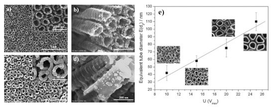 (a–d) SEM images of a layer of TiO2 nanotubes formed by the anodization of Ti foil in a glycol fluoride solution at 25 V covered by various amounts of Ag: (a,b) 0.01 mg·cm−2, (c,d) 0.06 mg·cm−2. (e) The diagram presenting the dependence between applied anodic voltage and the diameter of formed nanotubes. Reprinted with permission from [19]. Copyright 2010 Elsevier.