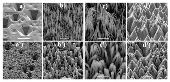 SEM images of GaN samples after: (a) orthodox etching at 420 °C for 10 min, (b,c) galvanic photo-etching for 8 and 12 min, respectively, (d) electroless photoetching for 120 min. (a’–d’) shows SEM images of similar samples after sputtering of an Au-Ag alloy. The samples are tilted 45°. The scale bars represent 1 μm. Reprinted with permission from [37]. Copyright 2018 Elsevier.