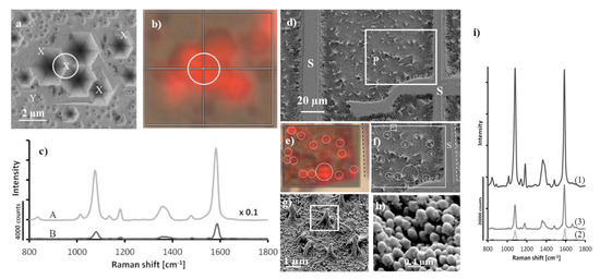 (a,b) SEM images and corresponding SERS intensity map of the spectrum of p–mercaptobenzoic acid adsorbed on the surface of GaN/AuAg (plot represents intensity of the band at 1590 cm−1), (c) recorded SERS spectra of p–mercaptobenzoic from A: point indicated by white circle on (a) and B: point indicated as Y. (d,f–h) SEM images of photo-etched GaN samples, (e) SERS intensity map of the band at 1590 cm−1 of p–mercaptobenzoic acid and (i) SERS spectra of p–mercaptobenzoic acid recorded on substrates having various GAN morphologies: 1 nano-pillars, 2 on the matrix, 3 at the position matched as X in (a). Reprinted with permission from [37]. Copyright 2018 Elsevier.