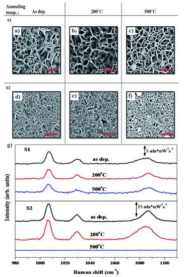 SEM images of GaN nanowalls covered with silver: less densely packed (S1) and more densely packed (S2). (a,d) Without annealing, (b,e) after annealing at 200 °C, (c,f) after annealing at 500 °C. (g) SERS spectra for substrates S1 and S2. Thiophenol was used as a test molecule. Reprinted with permission from [38]. Copyright 2015 Royal Society of Chemistry.
