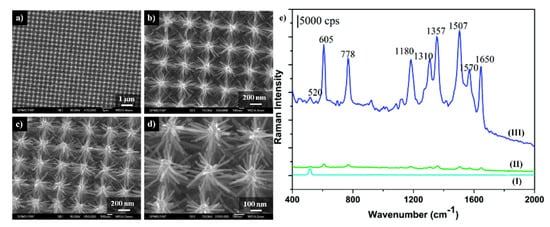 (a–d) SEM images of the ordered Si/ZnO nanotrees: (a,b) top view, (c,d) 20o titled view, (e) SERS spectra of molecules of rhodamine 6G adsorbed from the solution with the concentration of 10−6 M collected from: (I) Si/ZnO nanotrees, (II) Ag nanoparticles substrate prepared by the sputtering method, (III) Si/ZnO nanotrees decorated by Ag nanoparticles. Reprinted with permission from [40]. Copyright 2010 American Chemical Society.
