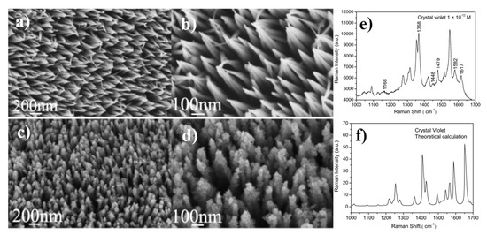 (a,b) SEM images of ZnO nanoarrays; (c,d) SEM images of ZnO/Ag composite nanoarrays, (e) SERS spectrum of crystal violet adsorbed on ZnO/Ag composite nanoarrays from 10−12 M crystal violet solution, (f) theoretically calculated Raman spectrum of crystal violet. Reprinted with permission from [41]. Copyright 2011 Elsevier.