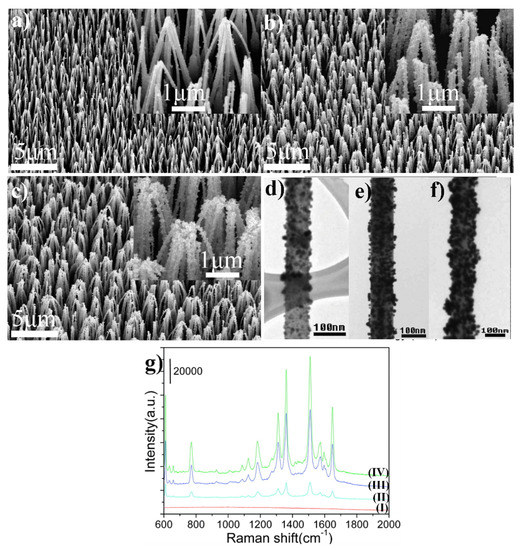 (a–c) SEM images of ZnO/Au nanoneedle arrays prepared at different HAuCl4 concentrations: (a) 0.1, (b) 0.3 and (c) 0.5 mM. Inset shows corresponding high magnification SEM images. (d–f) TEM images of ZnO/Au nanoneedles prepared at different HAuCl4 concentrations: (d) 0.1, (e) 0.3 and (f) 0.5 mM. (g) SERS spectra of molecules of rhodamine 6G adsorbed on: (I) ZnO (II), (III) and (IV) ZnO/Au produced using HAuCl4 at various concentrations: 0.1, 0.3 and 0.5 mM, respectively. Reprinted with permission from [42]. Copyright 2009 American Chemical Society.