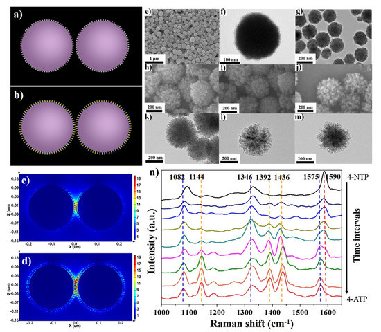 (a) The simulation model of Fe3O4@TiO2@Ag and (b) Fe3O4@TiO2@AuAg nanoparticles, (c) the calculated electromagnetic field distribution around Fe3O4@TiO2@Ag and (d) Fe3O4@TiO2@AuAg nanoparticles. The incident light wavelength was 785 nm. (e) SEM images of Fe3O4 spheres, (f) TEM image of Fe3O4@TiO2 core–shell sphere, (g) SEM images of Fe3O4@TiO2@Ag sphere, (h–j) SEM images of Fe3O4@TiO2@AuAg nanospheres with various molar ratio of Ag:Au: (h) 1:2, (i) 1:1, (j) 2:1, (k–m) the corresponding TEM images, (n) SERS spectra illustrating the reduction of 4-nitrophenol to 4-aminophenol catalysed by Fe3O4@TiO2@Au-Ag nanospheres. Reprinted with permission from [51]. Copyright 2016 Elsevier.