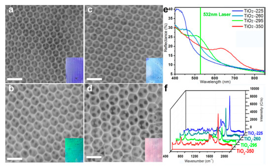 (a–d) SEM images of TiO2 inverse opal substrates calcined in various temperatures: (a) 225, (b) 260, (c) 295, (d) 350 °C. (e) Reflection spectra of TiO2 inverse opal substrates. (f) SERS spectra of methylene blue adsorbed from 10−5 M aqueous solution on various inverse opal substrates. Reprinted with permission from [53]. Copyright 2014 American Chemical Society.