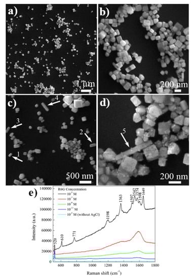 (a–d) SEM images of the AgCl nanoparticles produced by laser ablation, (e) SERS spectra of molecules of rhodamine 6G on AgCl nanoparticles adsorbed from solutions with various concentrations. Reprinted with permission from [64]. Copyright 2012 Elsevier.