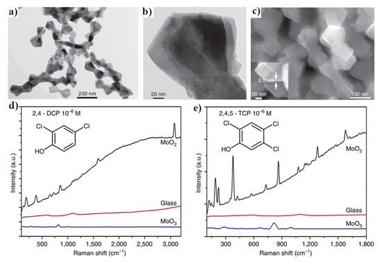 (a,b) TEM images of the MoO2 nanocrystals, (c) SEM image of the MoO2 nanocrystals, (d,e) SERS spectra of polychlorinated phenols adsorbed on the surface of MoO2. Reprinted with permission from [70].