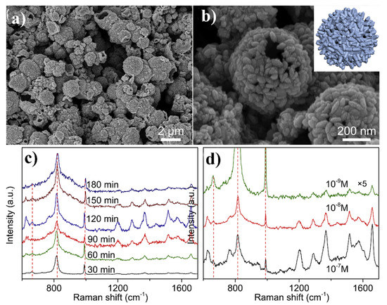 (a,b) SEM images of hollow MoO2 spheres, inset shows the schematic structure of this nanomaterial, (c) SERS spectra of rhodamine 6G adsorbed on the hollow MoO2 nanospheres after various anodization times from 10–7 M rhodamine 6G solution, (d) SERS spectra of rhodamine 6G adsorbed from solutions with different concentrations on the hollow MoO2 nanospheres. Reprinted with permission from [73].
