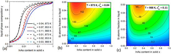 We start our calculations with NWs growth at different temperatures T. Figure 2a shows the evolution of the liquid composition y required to form the NW of composition x at a fixed As atomic fraction and different T. The real values are expected to vary quite considerably depending on whether the droplet is In- or Ga-rich according to the respective phase diagrams [31]. Therefore, two sets of values for were chosen which correspond to pure In or pure Ga droplets. Despite the large difference in , the calculated y(x) curves reveal that the catalyst droplet consists mainly of In (y > 0.9) for the entire range of practical compositions of alloy (0.1 < x ≤ 1). This correlates with what has been reported earlier for NWs [28,36,37] and suggests that high In content in the liquid phase is thermodynamically required to grow solid . Consequently, in what follows we only use the values corresponding to pure In droplet. The temperatures considered are above the critical temperature of 816 K [28], which is why no miscibility gap is present in Figure 2a. The relationship between the solid and liquid compositions can now be used to quantify the influence of adding Si atoms to the catalyst droplet on the nucleation probability of InGaAs NW monolayers. We fix only temperature T (and hence ), then the function can be calculated using the y values deduced for each x. The atomic fraction of Si is varied up to 0.05. The results are shown in the contour plots in Figure 2b,c for two different T. The numbers given on the solid level lines represent different values of , expressed in meV. The calculated values are always positive, showing that the presence of Si in In-rich catalyst droplets is beneficial for nucleation of NWs regardless of their composition x, including almost pure GaAs solid (x0). This is different from the results reported in Reference [29], where pure GaAs NWs were grown from pure Ga droplets. The effect is due to the presence of In in the catalyst droplet which, even at small x, may have a great impact on the growth thermodynamics due to the interactions with the co-existing species in liquid. The highest values of , corresponding to the largest enhancement of the nucleation and growth rates of InGaAs NWs, are obtained for compositions from 0.1 to 0.5 for both temperatures. The maximum of decreases with increasing the growth temperature. It is about 160 meV at T = 872 K and decreases to 65 meV at T = 988 K. This high temperature is typical for growing InGaAs NWs by HVPE technique.