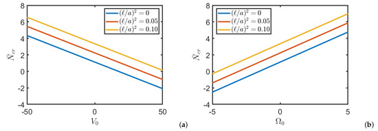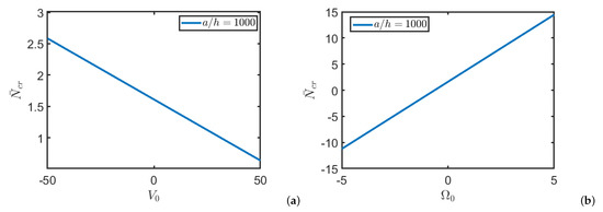 Figure 2 shows the critical buckling load by varying the electric and magnetic potentials. The present results agree well with the ones presented in the mentioned papers [74,75]. It is emphasized that the slight difference in the results is due to the fact that in the cited studies the potential is approximated using three contributions: one parabolic, one linear and one constant unlike the present study in which the potentials are approximated with a cosine function and a linear part. In addition, in the cited studies, the in-plane components , , and of electric and magnetic fields are null.