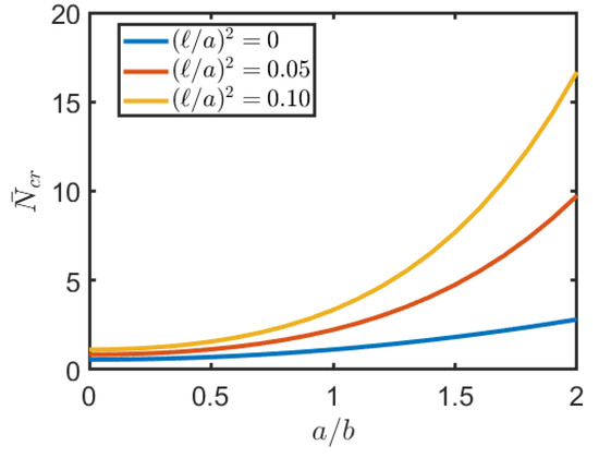 In the applications below and are always considered. Table 2 shows the dimensionless critical load of a square plate FG for different values of externally applied potentials and non-local parameter. It can be seen that as the non-local parameter increases, the value of the critical load increases. It can also be seen that by increasing the magnetic potential the critical load increases while the electric potential has the opposite effect. This last phenomenon is also clearly visible in Figure 3, where the value of the critical load is reported as the external potentials applied vary and for different values of the non-local parameter. Finally it is remarked that for same values of the electric and magnetic potentials the critical load takes a negative value, thus, buckling occurs for traction loads instead of compression. Figure 4 shows the dimensional critical load when the aspect ratio varies and for different values of the non-local parameter. As expected the critical load increases as the plane becomes of rectangular shape and as the nonlocal parameter increases.