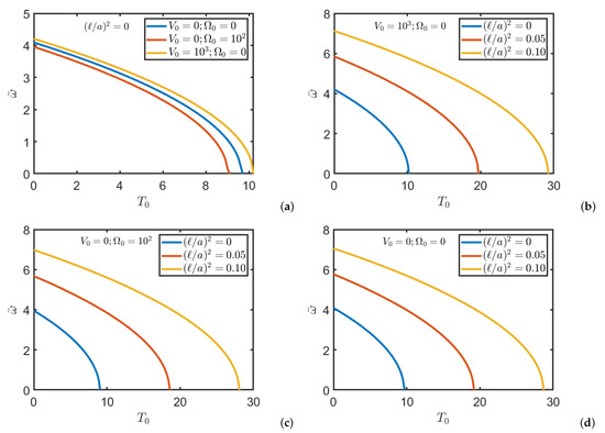 Figure 5 shows the influence of temperature and externally applied potentials on the natural frequency of a nanoplate composed by BaTiO/CoFeO. The plate considered is a simply supported square plate and the thickness ratio is . In particular, the critical temperature of each structure can be identified when the frequency becomes zero.