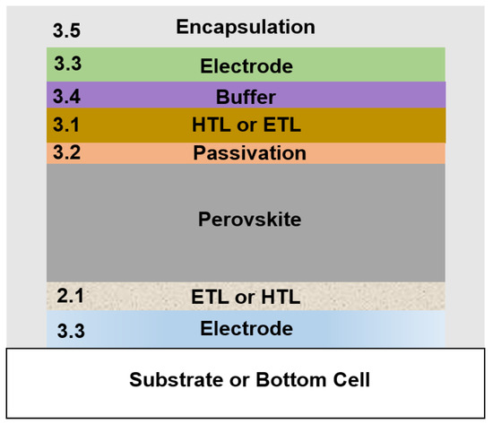 As the perovskite and organic transport layers are particularly susceptible to elevated temperatures and exposure to certain ALD precursors under low vacuum, this review will be divided into parts focusing on the developments below and above the perovskite layer. As summarized in the schematic graphic in Figure 1, ALD can be applied in PSCs for the electrodes, charge transport layers (CTLs) below and above the perovskite, passivation layer, buffer layer, and encapsulation. The corresponding section numbers in this review for the application of ALD for each layer are shown in the schematic. First, in Section 2, we investigate the cases where ALD processes were adopted for the deposition of layers under the perovskite layer as electron transport layers (ETLs, Section 2.1.1) and hole transport layers (HTLs, Section 2.1.2).