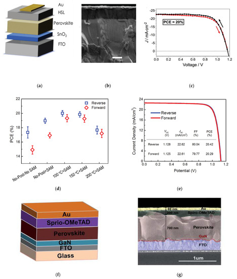 Incorporation of atomic layer deposition (ALD) processes for SnO2 as electron transport layer (ETL): (a) Schematic of device configuration; (b) Cross-sectional scanning electron microscopy (SEM) image of the planar SnO2-based PSC (scale bar is 200 nm); (c) Illuminated current density vs. voltage scans for PSC with 15 nm of ALD SnO2. Reproduced from [24], with permission from the Royal Society of Chemistry, 2017. Incorporation of ALD processes for SnO2 as ETL in PSC with self-assembly monolayer (SAM) treatments: (d) Comparison of power conversion efficiency (PCE) between reverse and forward voltage scan for varying post-annealing and SAM treatments; (e) Illuminated current density vs. voltage (J–V) of optimal device. Reproducedfrom [25], with permission from Wiley, 2017. Incorporation of ALD processes for GaN as ETL in PSC: (f) Solar cell device configuration; (g) Cross-sectional SEM image of device. Reproduced from [30], with permission from the Royal Society of Chemistry, 2019.