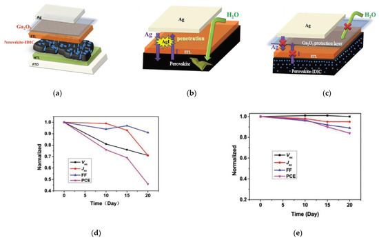 Incorporation of ALD Ga2O3 as barrier layer between the ETL and top electrode in the PSC: (a) Schematic of the device configuration; (b) Illustration of degradation mechanism in the case without Ga2O3; (c) Illustration of the protection effect from degradation in the case with Ga2O3; (d) Normalized photovoltaic performance parameters as a function of ambient storage time for PSCs without Ga2O3; (e) Normalized photovoltaic performance parameters as a function of time for PSCs with Ga2O3. Reproduced from [65], with permission from Wiley, 2018.