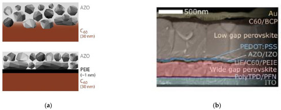 Incorporation of ALD AZO as recombination layer in all-perovskite tandem solar cell: (a) Schematic of AZO without and with poly(ethylenimine) ethoxylated (PEIE) nucleation layer; (b) Cross-sectional SEM of solar cell stack; Reproduced from [63], with permission from Elsevier, 2019.