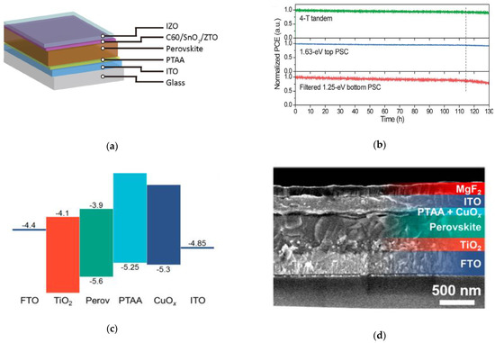 Incorporation of ALD SnOx and zinc tin oxide (ZTO) in perovskite tandem devices: (a) Device stack configuration of the top perovskite cell; (b) Normalized PCE as a function of time for the various PSC devices. Reproduced from [59], with permission from the American Association for the Advancement of Science, 2019. Incorporation of atmospheric-pressure chemical vapor deposition (AP-CVD) of CuOx as a buffer layer in semitransparent PSC: (c) Schematic of band alignment of the device; (d) Cross-sectional SEM image of the device stack. Reproduced from [64], with permission from the American Chemical Society, 2020.