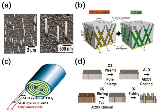 (a) SEM image of nanowires array []; (b) schematic illustration of 3-D Cu/Ni core/shell and Ni carbon nanotubes (CNTs) []; (c) schematic diagram of highly homogeneous Al- and Zn-doped TiO2 nanotube by ALD with various cyclic sequences []; (d) schematic illustration of fabrication of nanostraws array using a track-etched polycarbonate membrane [].