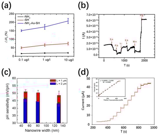 (a) △I/I0 as a function of mercury ion concentration for different modified SiNW devices []; (b) real-time current response to various metal ions of 10 μg/L−1 []; (c) the pH sensitivity of nanowires with different widths and gate lengths (L) of Effects of 1 and 2 μm []; (d) the current response of the Ag/halloysite nanotube (HNT)/MoS2-carbon paste electrode (CPE) to the nitrite with various concentrations. The inset shows the calibration curve of current versus nitrite concentration from 2 to 425 µM [].