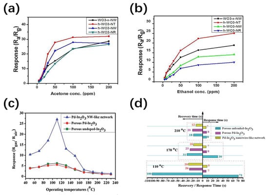 The response (Ra/Rg) of WO3−x nanowire, h-WO3 nanotube, h-WO3 nanowire and h-WO3 nanorod versus acetone (a) and ethanol (b) concentration []; (c) the response of porous unloaded-In2O3, porous Pd–In2O3 and Pd–In2O3 NW-like network under different temperatures to 5 ppm NO2 []; (d) the response and recovery times of three samples to 5 ppm NO2 at 110, 170 and 210 °C [].