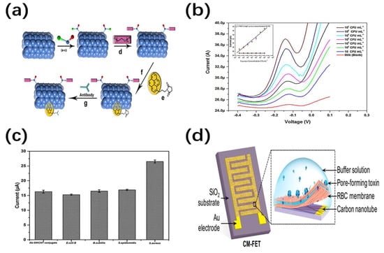(a) Schematic illustration of the synthesis of modified MWCNT []; (b) the current versus voltage under different S. aureus concentrations from 10 to 107 colony-forming units (CFU) mL−1 in milk sample []; (c) the Histogram of selectivity for S. aureus vs. E. coli B, B. subtilis, and S. epidermidis []; (d) schematic illustration of the cell-membrane-coated CNT field-effect transistor (FET) [].