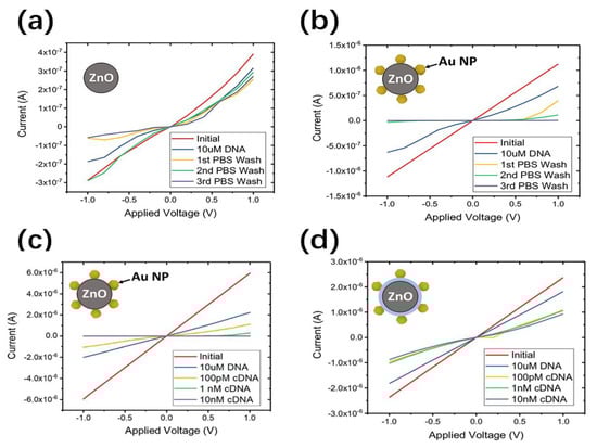 The response current-voltage curves of (a) bare, (b,c) Au NP decorated and (c) HfO2 Passivated ZnO NW sensors with phosphate bufered solution (PBS) solution or cDNA exposure. HfO2 passivation limits the change of NW conductivity with solution exposure (c), and AuNP modification maintains the sensitivity to DNA (d) [].