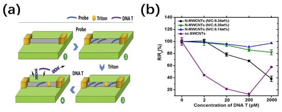 (a) Schematic illustration of the functionalization and sensing of the CNT-based biosensor []; (b) the response of N-doped MWCNTs with various N/C and sc-MWCNTs versus DNA concentration [].