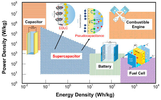 Fossil fuel shortages and environmental concerns regarding its uses for energy generation are among the most severe challenges in achieving sustainable development. Therefore, pursuits for alternative energy sources and energy storage devices are essential. Several critical parameters need to be achieved by those alternative energy storage devices, including high energy density, high power density, long lifecycle, environmental safety, and low cost [1,2,3]. To meet these critical parameters, the development of electrochemical-based energy storage devices (i.e., batteries and supercapacitors) still possesses fundamental research challenges, even though the earliest electrochemical supercapacitor patent was filed in 1957 by General Electric [4]. The Ragone plot (Figure 1), utilized as a figure-of-merit of energy storage devices, shows that the supercapacitor performance lies between those of conventional capacitors and batteries. A Supercapacitor (SC) provides a higher energy density and higher power density than batteries (>10 kW kg−1) and longer lifecycles (>105 cycles) than a traditional capacitor [5]. Therefore, supercapacitors hold great prospect as ubiquitous energy storage devices for future electronic systems which requires high power and energy density yet durability and fast charge/discharge (in seconds).