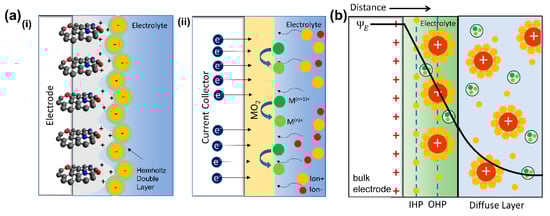 (a) Illustration of the Stern model for electrolyte ions on a charged electrode in (i) an electric-double-layer capacitor (EDLC) and (ii) a pseudo capacitance supercapacitor, as well as (b) a schematic model of ion distribution and mechanism.