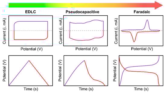 Schematic cyclic voltammograms and corresponding charge-discharge curves of electric-double-layer capacitor (EDLC), pseudocapacitor, and faradaic-type materials.