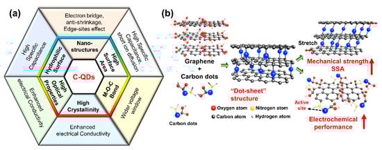 (a) A schematic showing the figure-of-merits of C-QDs composites for Supercapacitor (SC) applications that should be pursued and (b) a schematic illustration of the dot-sheet porous structure that consists of graphene and carbon dots: reproduced from Reference [115]. Copyright Royal Chemistry Society, 2018.