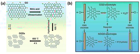 (a) Schematic of synthesis of GQDs with uniform size for an SC device: reproduced from Reference [119]. Copyright American Chemical Society, 2018. (b) Schematic Illustration of GQDs and an N-GQD solution as the electrolyte in EDLC supercapacitors: reproduced from Reference [120]. Copyright Springer Nature, 2016.