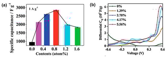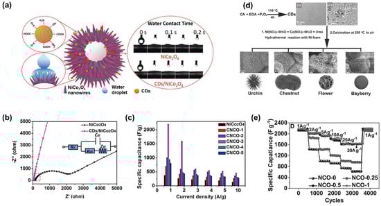 CDs are reported not only to enhance the supercapacitor performances of metal oxide but also to play a role as a structural directing agent of NiCo2O4 composites [133]. By varying the concentration of CDs, the nanostructure morphology of NiCo2O4 changes significantly, as illustrated in Figure 7d. These distinguished morphologies provide the divergent type of specific surface area that results in distinct specific capacitance values of each composites as well as cycling durability, as shown in Figure 7e. The differences in morphological structures also might become the distinguished ion diffusion mechanism on the composite materials.