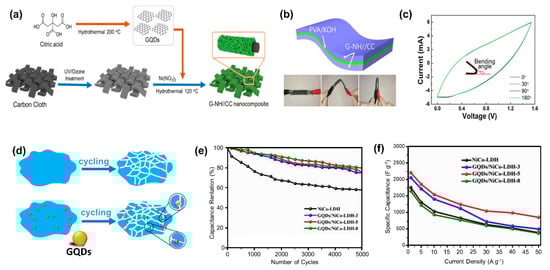 It has been reported that the addition of GQDs on transition metal oxide (TMO) or transition metal sulfide (TMS) materials is mainly to increase the composite conductivity [152]. Figure 9a shows the addition of GQDs into Ni(OH)2/carbon cloth. This addition enhanced the conductivity performance of the SC electrodes and made it capable of operating for up to 2000 cycles. The enhanced electrical conductivity was thought to cause the formation of ohmic contact by Ni(OH)2 due to the addition of GQDs [153]. By the addition of GQDs, shown in Figure 9b, the electrodes are highly flexible. Further investigation of the GQDs/Ni(OH)2 are shown in Figure 9c, which tell us with the different bending angles that no significant changes on the CV was observed.