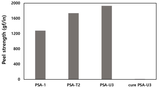 Peel strength of pressure-sensitive adhesive PSA-1, PSA-T2, PSA-U3, and the cure PSA-U3 tapes.
