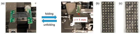 (a) Photos of the unfolded and folded g-TC films during the U-folding tests; photos of the g-TC films (b) before and (c) after 10,000 cycles of the U-folding tests.