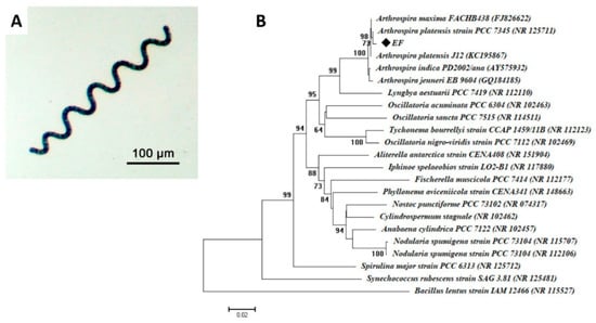 Microscopic and molecular identification of cyanobacteria Arthrospira platensis strain (EF). (A) denotes a typical single trichome of A. platensis (Class: Cyanophyceae); (B) denotes a phylogenetic analysis of 16S rRNA sequences of cyanobacterial strain with reference sequences from NCBI. ♦ refers to 16S rRNA sequences of A. platensis. The analysis was performed in MEGA6 using the neighbor-joining method.