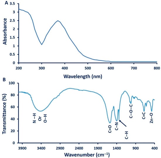 The functional groups, as well as the chemical structures of A. platensis-mediated ZnO-NPs synthesis was determined by FT-IR analysis (Figure 3B). The FT-IR spectra exhibit seven intense peaks at 3415, 1600, 1410, 1341, 1025, 676, and 503 cm−1. The broad absorption peak at 3415 cm−1 is related to N–H overlapped with a stretching O–H band [33]. The breadth of this broad peak could be attributed to the formation of intra- and intermolecular hydrogen bonds [40]. The low-intensity peak observed at 3000 cm−1 is related to the stretching CH2 of asymmetric and symmetric carbohydrates and/or lipids [41], whereas the band at 1600 cm−1 is corresponding to the stretching C=O vibration of proteins [42] or remaining acetate. The absorption wave of CH2 or CH3 of proteins is responsible for the vibration bending of the C–H at wavenumber 1341 cm−1 [40]. The observed band at 1410 cm−1 has corresponded to the C–N stretching bond of amino acid, whereas the band observed at wavelength 1025 cm−1 can be attributed to C–O–C ether of polysaccharides [33,43]. The successful formation of Zn–O was confirmed by the absorption band observed at 503 cm−1. Consistent with our data, the FT-IR analysis of green synthesized ZnO-NPs showed the Zn–O absorption band has been observed at wavelength 485 cm−1 [44], 442 cm−1 [45], in range 400 to 500 cm−1 [46], or at wavelength 782 cm−1 [47], 450 cm−1, and 600 cm−1 [48]. The data of FT-IR analysis exhibit the role of organic substances in A. platensis extract in the reduction, capping, and stabilizations of biosynthesized ZnO-NPs. Azizi et al. [49] suggested that the formation of ZnO-NPs was accomplished as a result of the interaction between oxygen in functional groups involved in cell extract of Sargassum muticum and zinc molecules in salt precursors.