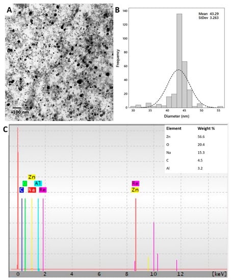 Transmission electron microscope (A), particle size distributions (B), and energy-dispersive spectroscopy (C) for ZnO-NPs synthesized by A. platensis.