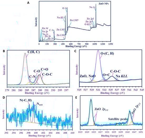 X-ray photoelectron spectroscopy analysis of ZnO-NPs synthesized by A. platensis. (A) Overview survey; (B–E) denotes C 1s, O 1s, N1s, and Zn 2p.