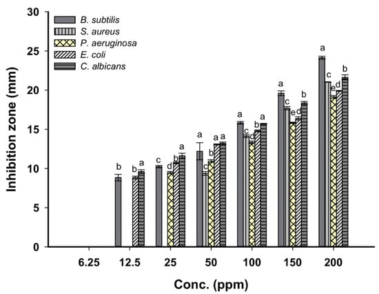 Antimicrobial activities of ZnO-NPs synthesized by A. platensis against Bacillus subtilis, Staphylococcus aureus, Pseudomonas aeruginosa, Escherichia coli, and Candida albicans. Data are statistically different at p ≤ 0.05 by Tukey’s test, (n = 3); error bars are means ± SE. The different letters, a–e, are signified the significance. Bars with the same letter for each concentration did not differ significantly.